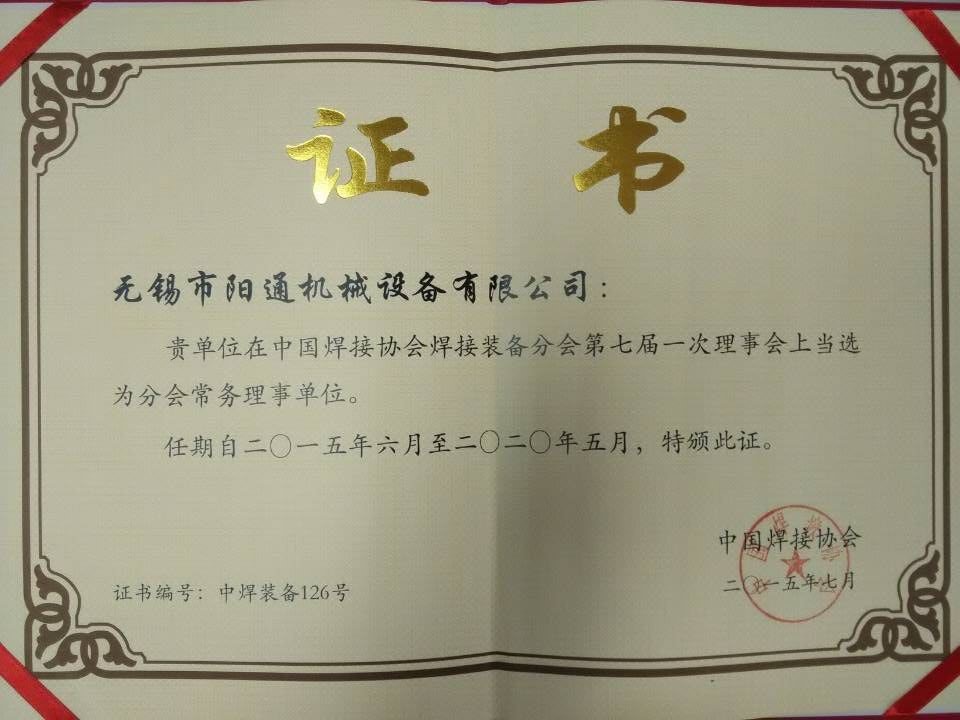 熱烈祝賀無錫市陽通機械設備有限公司連任中國焊接協(xié)會焊接裝備分會常務理事單位
