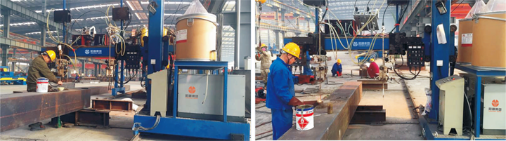 本機采用垂直電渣焊將內隔板與周圍鋼板焊接牢固。有熔嘴式與熔絲式二種電渣焊可供客戶選擇。熔嘴式操作簡單,投資省,使用成本高;熔絲式操作復雜,投資大,使用成本低。